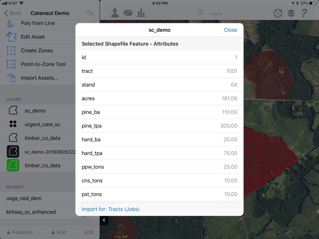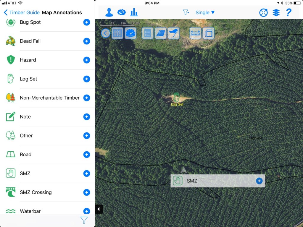 - TimberGuide Mobile App – for collecting and viewing information about forest assets and synchronizing that information back to the hosted database. The mobile app includes standard street and aerial base maps, a popup display for the underlying Shapefile attribute fields, geotagged notes and icons, and simple mapping tools such as area and linear measurement, pan and zoom.
