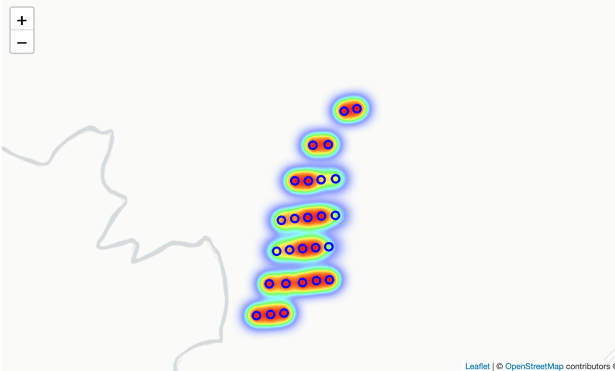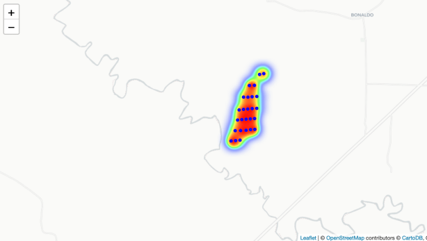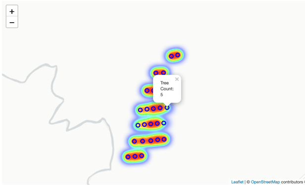 Here is the heat map at a small scale. Red areas have higher tree count values relative to the yellow and green areas.