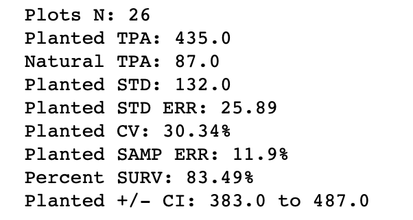 Notice the results show that the planted trees from our inventory averaged 435 per acre, compared to the 519 that were initially planted. Therefore, the survival was 83.5% of the initial planting density for this plantation. Overall this is not bad, but it could be better.