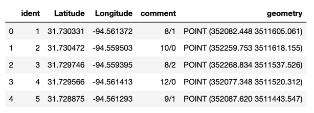 - “geometry” – this stores the spatial object, geometry type (Point). This column is required for a GeoDataFame object.