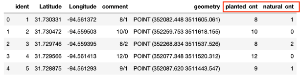 The next image shows the resulting GeoDataFrame. Notice the two additional columns “planted_cnt” and “natural_cnt”.
