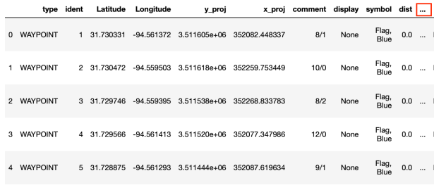 The next image shows the first five rows from the raw data read from the ESRI shapefile. The ellipsis (…) in the right corner indicates that this data contains more columns than displayed in the Jupyter Notebook.